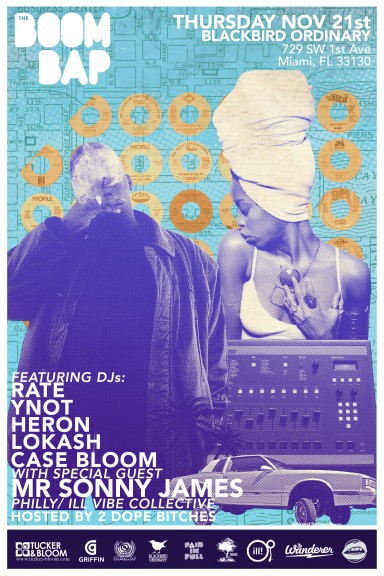 This event promised to be a great Hip-Hop night for Miami and it delivered. With DJ Boogie Blind (NY) from the world renowned turntablist crew The X-Ecutioners headlining and support from Case Bloom (Philly/Tucker & Bloom), Rate (Nashville/The Boom Bap) and Miami’s own DJ YNOT and DZA (Peachfuzz), Hosted by 2DopeBitches’ own Aja Butler-Burns and Norma Moreno coupled with the the always refreshing and delicious cocktails provided by Blackbird O, the party had a great energy and brought out Miami’s beautiful people including local DMC Champ DJ Craze and the Slow Roast crew, among many others, to check it out.Following up last month’s jump off event, The BOOM BAP is back in Miami this month with more heavy hitters! Now enlisting one of Philly’s top party rockers, MR. SONNY JAMES (Illvibe Collective), special guest DJ LOKASH (CN/Bassmentbeats) and hometown heroes DJ Heron and resident DJ YNOT, Hosted by 2DopeBitches and Soarse Spoken, The party is, once again, about to be on and poppin’!